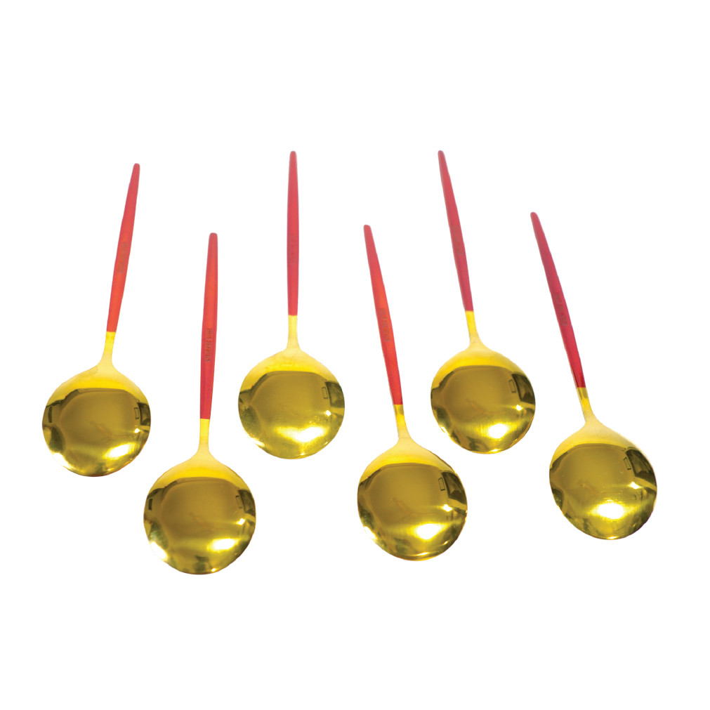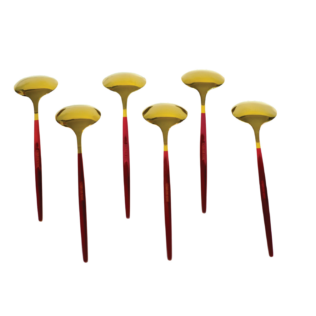 প্রতিটি চামচে রয়েছে টাইটানিয়াম গোল্ড প্লেটিং, যা শুধু চকচকে সৌন্দর্যই নয়—বরং দেয় এক ধরনের রাজকীয় ও মার্জিত অনুভূতি। চামচের লাল রঙের হাতল খাবারের টেবিলে তৈরি করে চোখে পড়ার মতো আকর্ষণীয় কনট্রাস্ট, যা অতিথিদের নজর কাড়বেই।
